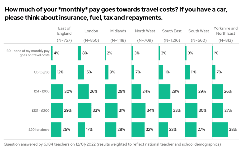 As the rest of the world seems to be going online, one major outlay for you is the cost of getting in to school. As we’ve previously found, over two-thirds of you get to school by car, and it’s even high in London, where 50% of teachers travel by car each day.