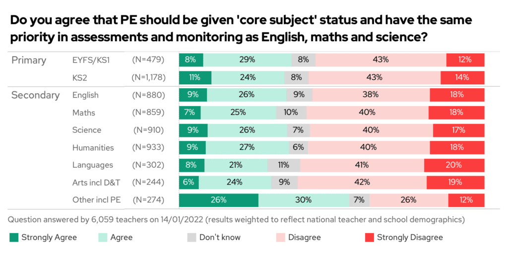 While many PE teachers were in favour of making PE core, there was still some disagreement in the group of teachers “Other incl PE” (although this may be from other teachers in this category!).