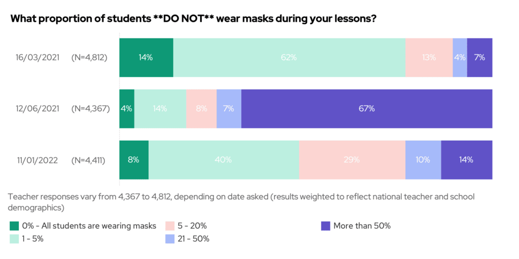 Back in March 2021, schools had just returned and most pupils were wearing masks. As term went on, and cases lowered, by June 2021 two-thirds of teachers reported that the majority of their pupils were not wearing masks.