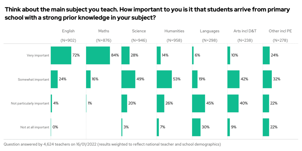 However, the results below show that English and maths teachers are also the ones who think it’s very important for students to arrive from primary school with strong prior knowledge of their subject (72% and 84%). Science teachers aren’t even half as likely to think this!