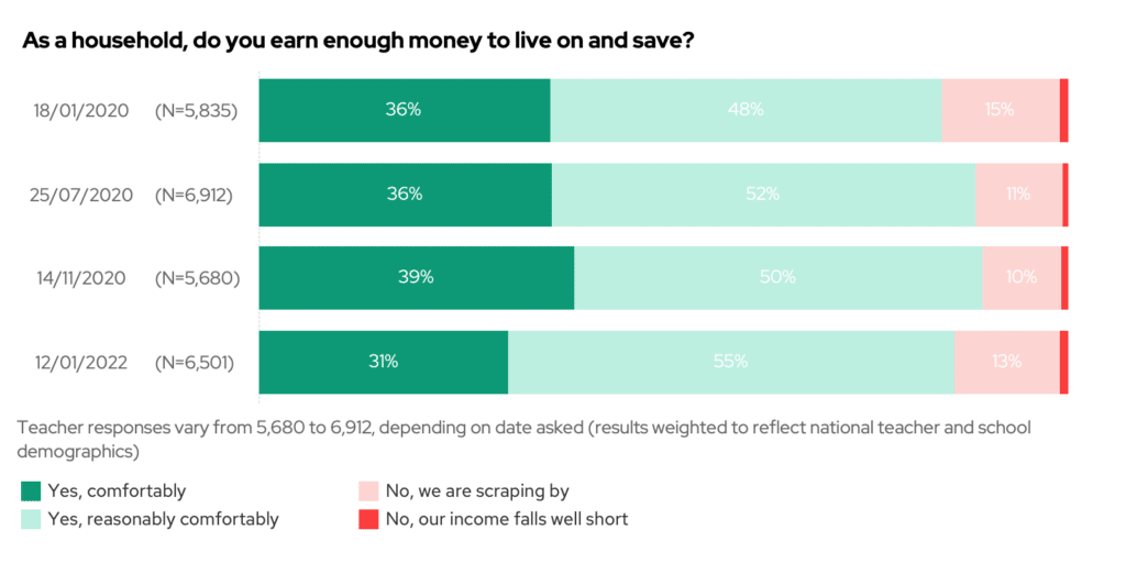 In the first year of the pandemic, we saw a slightly increase in the proportion of teachers who said they were living comfortably – however the rate is now at its lowest (31%) since we asked before the pandemic.