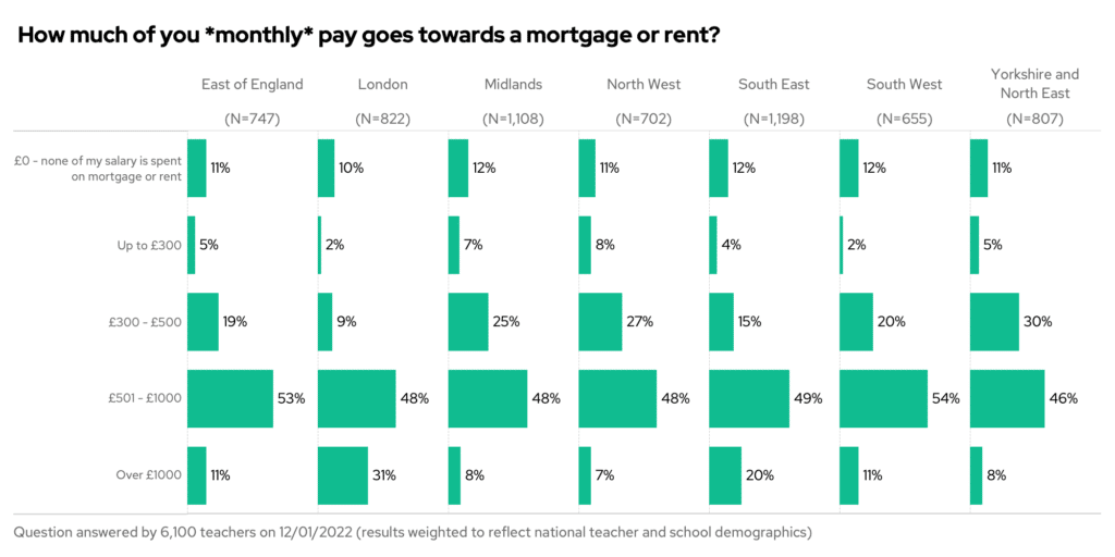 What Londoners lack in travel expenses, they make up for with mortgage or rent payments – with over 30% of teachers in London paying over £1000 per month on mortgage or rent payments. The South East fares similar, with 20% of teachers paying over £1000 per month.
