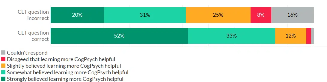Those who got the CLT question correct have far stronger beliefs that learning more about cognitive psychology will help their classroom practice.