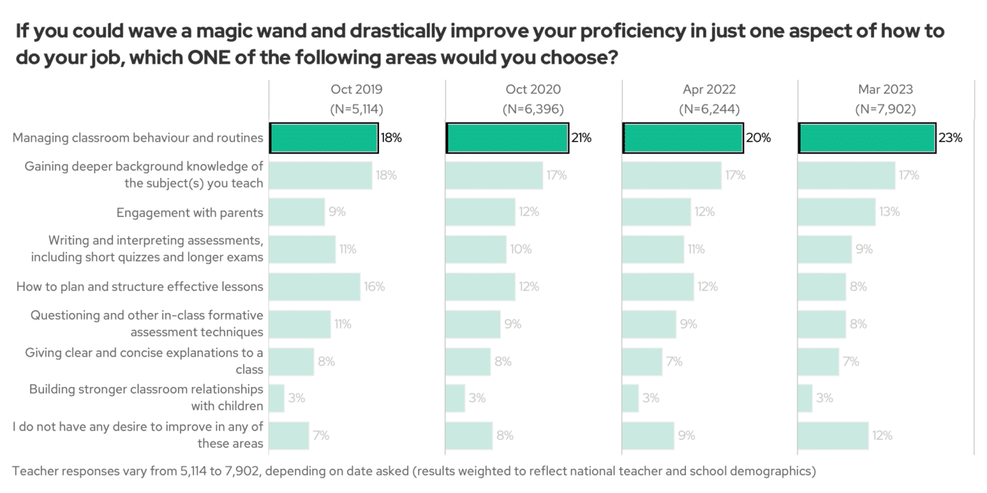 Another signal that something is going on, however, is that more teachers this year said that if you could just improve one aspect of your teaching you would choose to improve behaviour management – steadily up from 18% in October 2019 to 23% now.