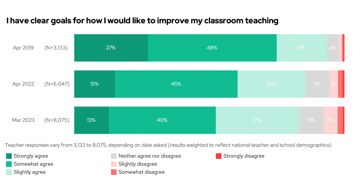 One other change we spotted is that fewer teachers currently have clear goals for how they would like to improve their classroom teaching compared to before the pandemic. Again, this makes sense given all the disruption. Most schools and teachers, in 2019, assumed the world was reasonably unchanging and so could plan where they wanted to get to next. The last few years disrupted that. The country barely seems to know what it’s headed towards, amid that it’s hard to keep a crystal clear school or personal improvement plan in mind.