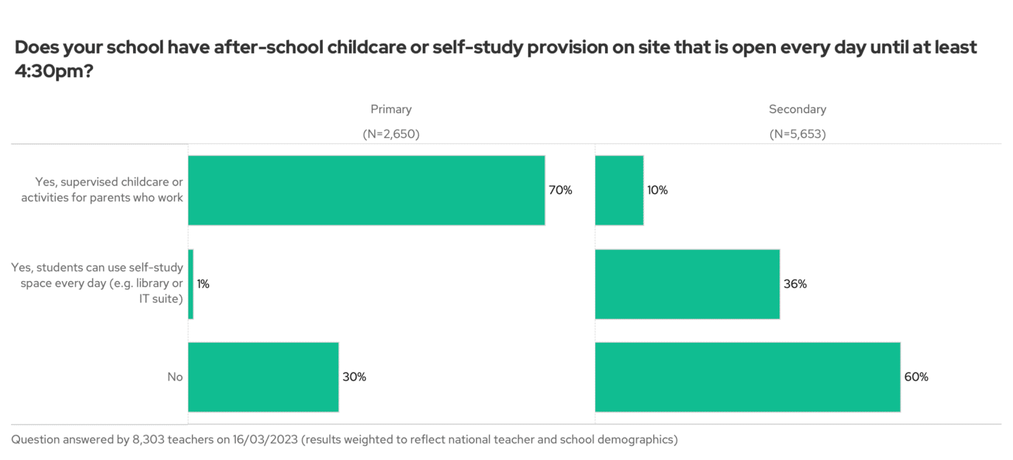 Our estimates are that most primary schools (70%) already have after-school childcare that’s open until 4.30pm each day. Around 40% of secondary schools have some provision available for children to stay onsite.