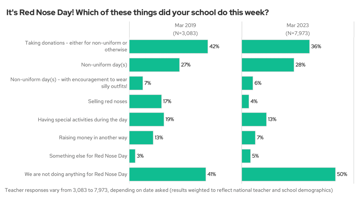 Many fewer schools are now selling red noses, raising money through activities or taking donations. Given the cost of living crisis plus the extra pressures on school (in which we include everything from extra absences to budget squeezes) there is likely less appetite for additional activities like this and a concern that families are less able to give.