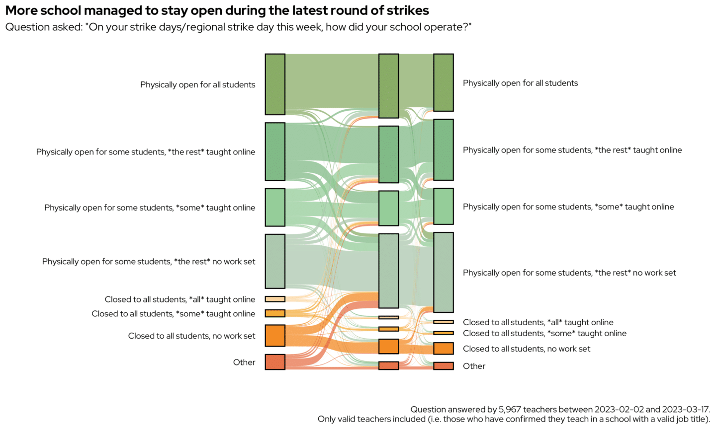 The Sankey chart below shows how changes occurred across three sets of strike dates – the first national one, the regional ones, and then the final one. The green blocks show schools that managed to stay open in some form. The orange and red show schools that were closed.