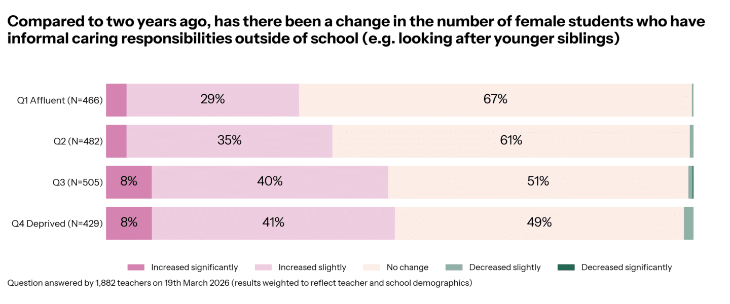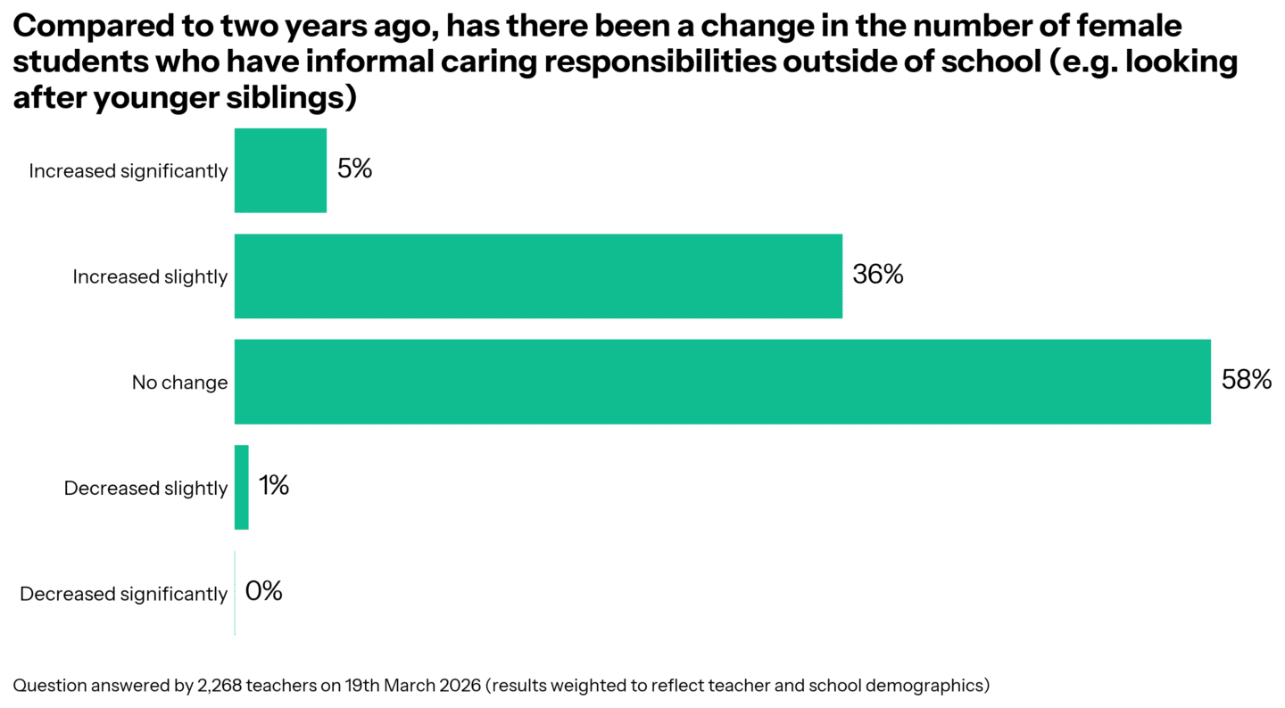 The BBC asked Teacher Tapp to help investigate. We asked senior leaders about the caring responsibilities young girls at school were facing. We found 41% reported there had been an increase in the past two years.