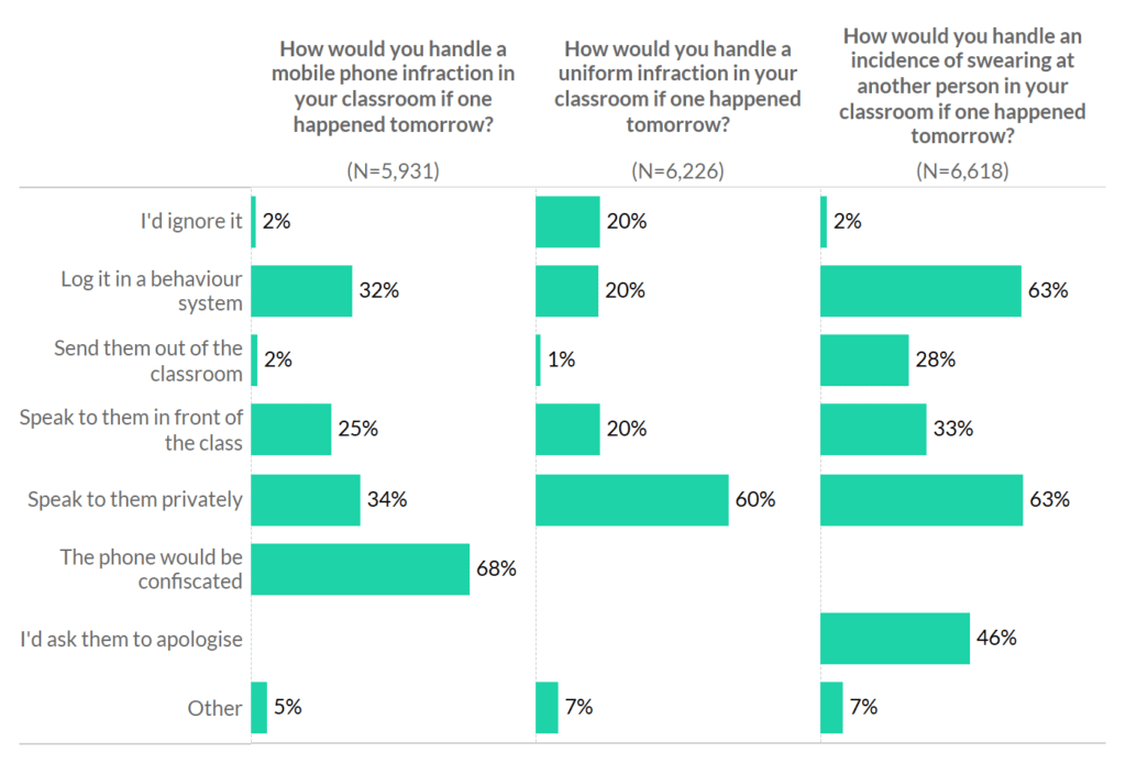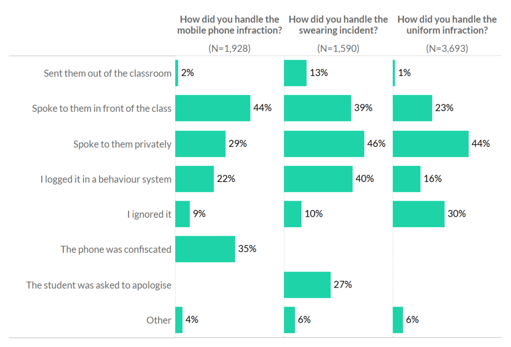 In the case of mobile phones, only 35% of teachers confiscated the phones, but 68% of teachers said they would confiscate one if they saw it. When it came to a swearing incident, 46% of teachers said they would ask the student to apologise. In reality, only 27% of teachers experiencing the situation actually did this.