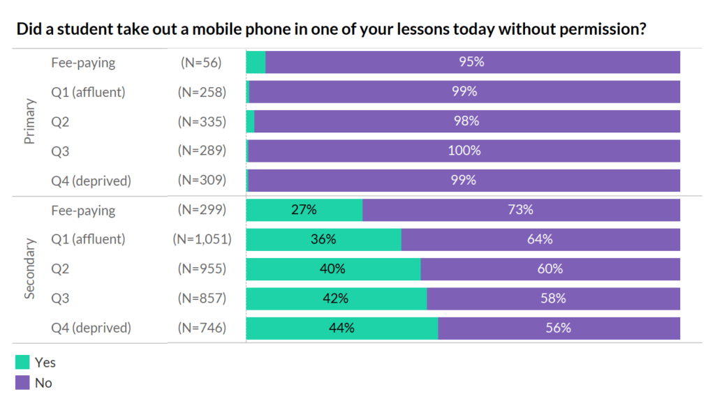 Likewise, mobile phones simply aren’t an issue in the majority of primary school lessons. (Perhaps because most primary schools take them in at the door). Again, the behaviour increases in secondary school depending on the level of deprivation.