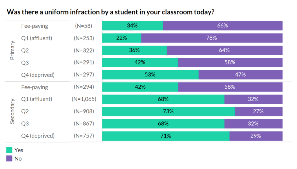 What are the common sanctions for such behaviours? Uniform infractions were the least likely to have a behaviour log or public telling off. Indeed, 30% of teachers ignored the issue (with several writing to let us know that they didn’t feel it was necessary to handle given it was covid-related).