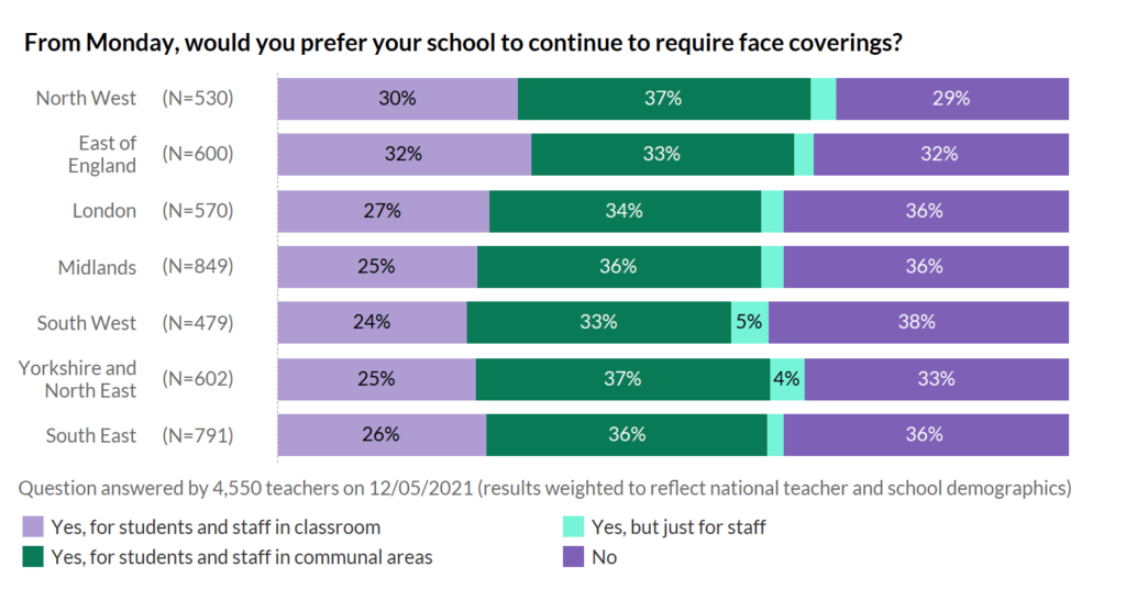 For those in secondary schools, we asked if you would like to see masks kept in some way in your school. Just over a third of you said no. However, two-thirds want to keep them, and more than a quarter want to see masks continue to be worn even in the classroom.