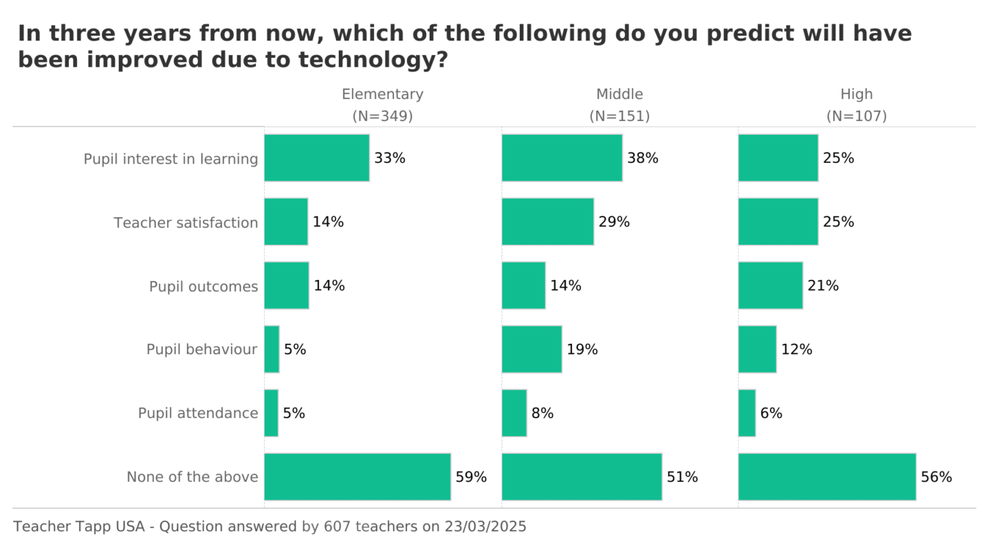 The most likely response from elementary, middle and high school teachers is that technology will not lead to improvements of pupils learning, teacher satisfaction, outcomes, behaviour or attendance.