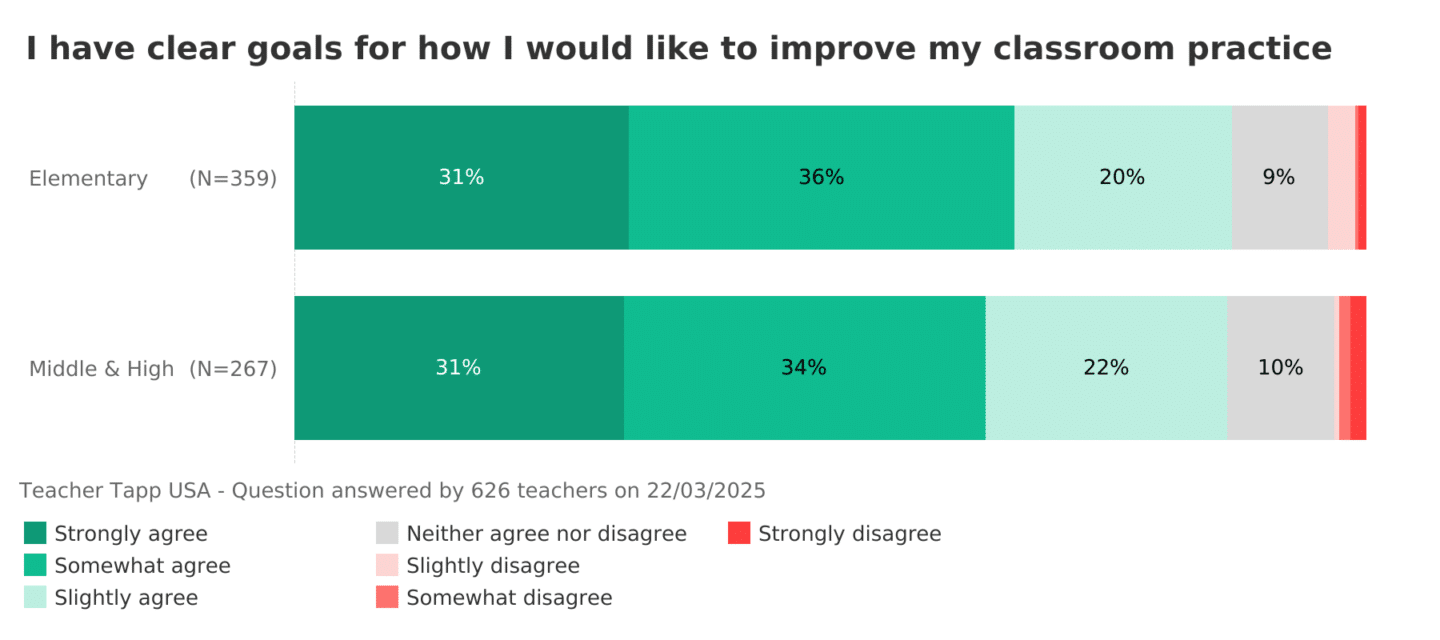 In slightly happier news, almost 90% of teachers agreed that they have clear goals to improve their classroom practice. This sentiment is consistent across grade levels – with 31% of teachers in elementary, middle and high schools ‘strongly’ agreeing with the statement.