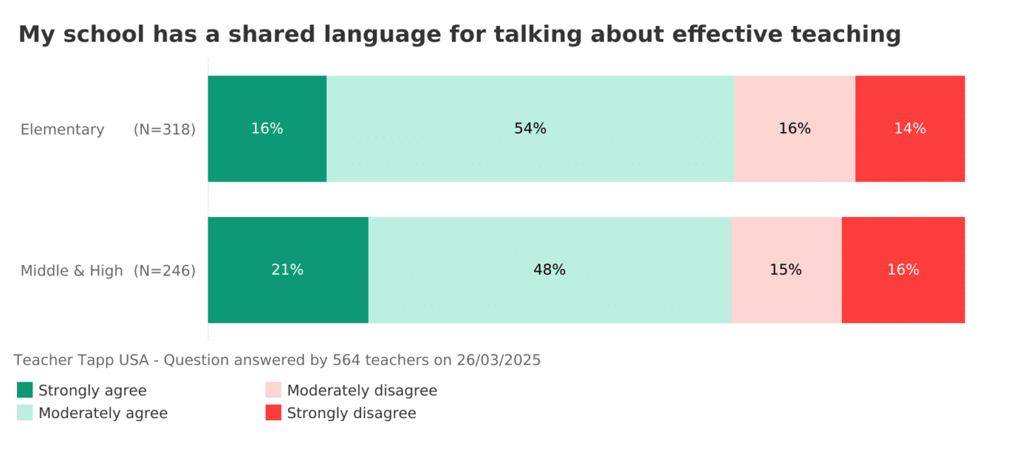 Approximately two-thirds of teachers agree that their school has a shared language for talking about effective teaching.
