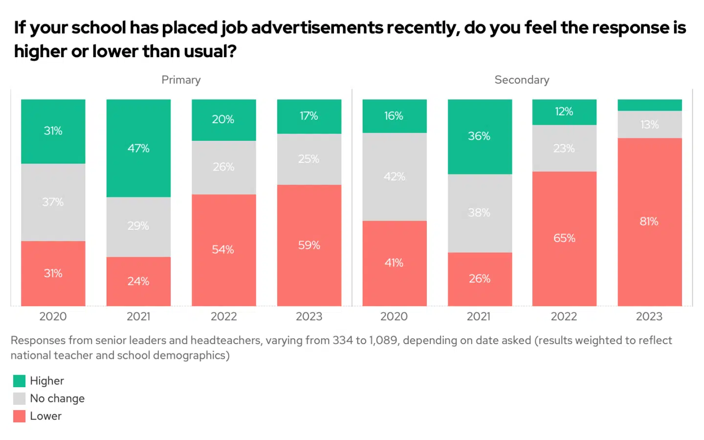 We’ve been asking lots of questions about teacher recruitment, vacant posts and career intentions. After first asking these questions in 2019, we’ve repeated the questions each year since. With COVID-19 severely disrupting the recruitment cycle in 2020 and 2021, we have now seen two more ‘normal’ cycles. This year we asked the questions once again, so what’s the state of teacher recruitment and retention in 2023?