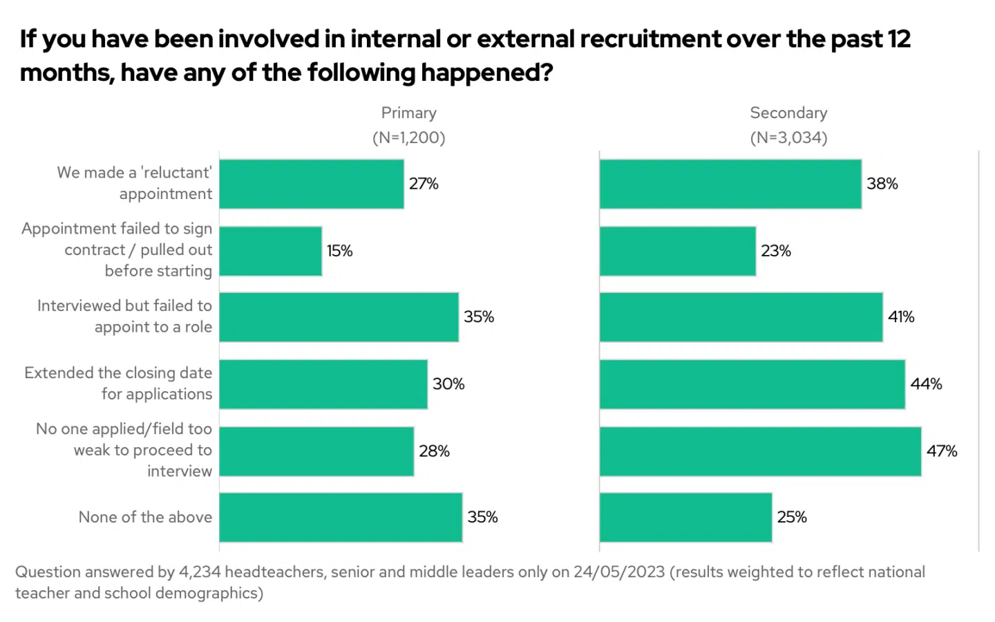 - Reluctantly appointing candidates who may lack adequate qualifications or have performed poorly in interviews (27% in primary; 39% in secondary)