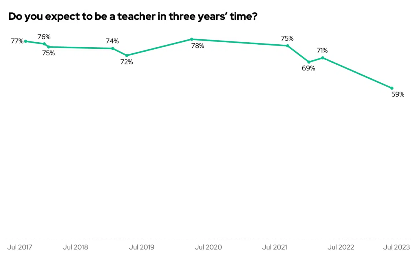 However, against the backdrop of a cost-of-living crisis and recent strike actions, this year marks a significant decline, hitting the lowest recorded figure, ten percentage points below the previous low. Teachers in their first five years of teaching are typically more susceptible to leaving the profession. Alarmingly, it is among this group that intentions to remain a teacher have dropped the most, plummeting from 72% in May 2022 to 55% today.