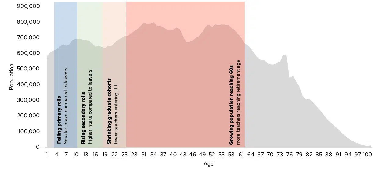 The supply of teachers, to some extent, depends on the size of the working-age population. Teaching attracts over 60% of its new trainees from the pool of recent graduates, making recruitment to initial teacher training more challenging when these cohorts are small. The size of cohorts graduating from universities will continue to decrease for a few more years, potentially exacerbating the difficulty in recruiting new teachers. By contrast, the population starting to reach retirement age is quite large and is increasing.