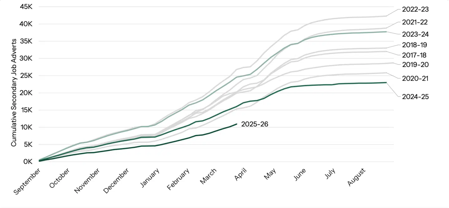 If your staffroom feels a bit quieter on the recruitment front this year, you’re not imagining it.