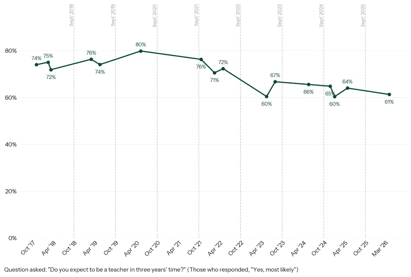 Since 2017, we’ve asked teachers regularly whether they expect to still be teaching in three years. Before the pandemic, around 75% said yes. The most recent data, from March 2026, puts that at 61% — a figure that has been broadly stable since 2022, but hasn’t recovered toward pre-pandemic levels.