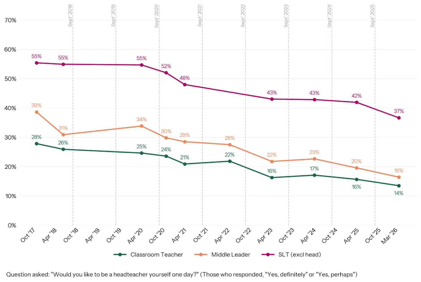 One finding that deserves more attention than it usually gets: the proportion of deputy and assistant headteachers who say they want to become a headteacher one day has fallen from 55% in 2017 to 37% today.