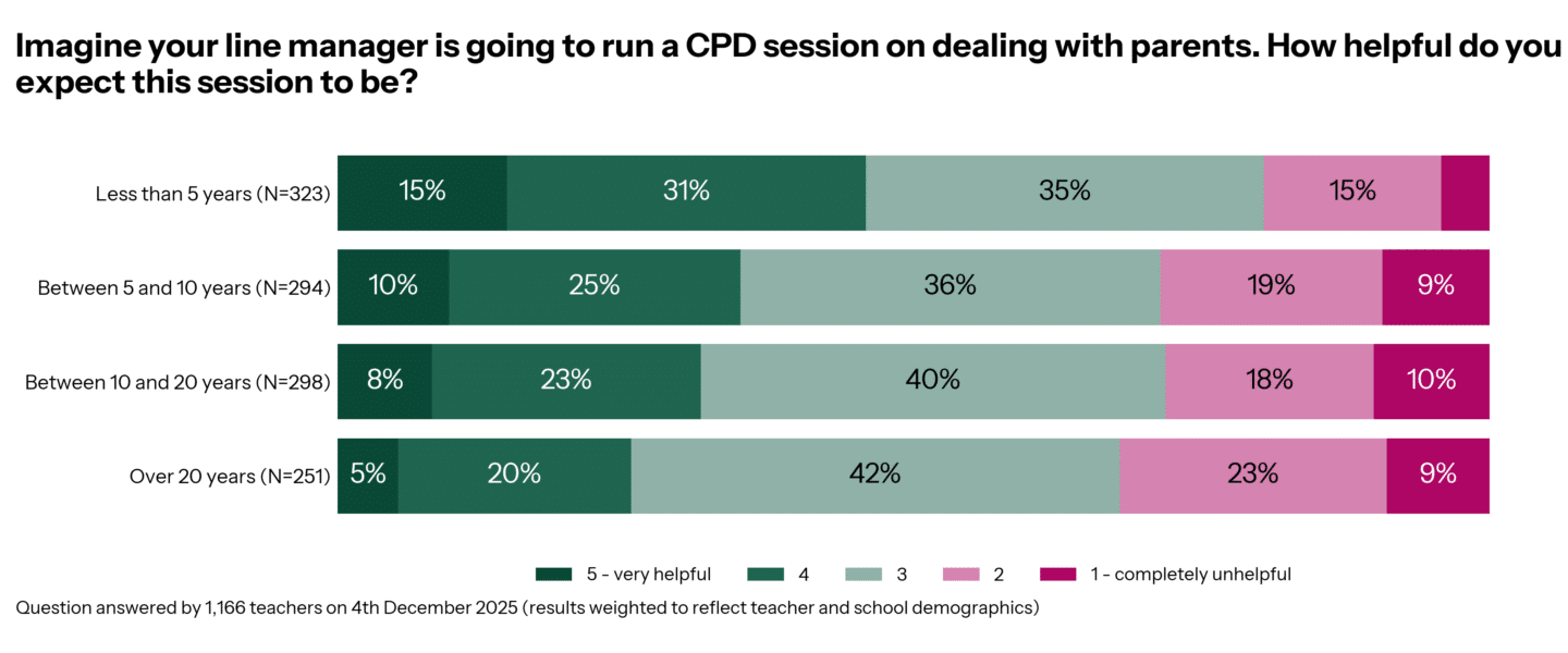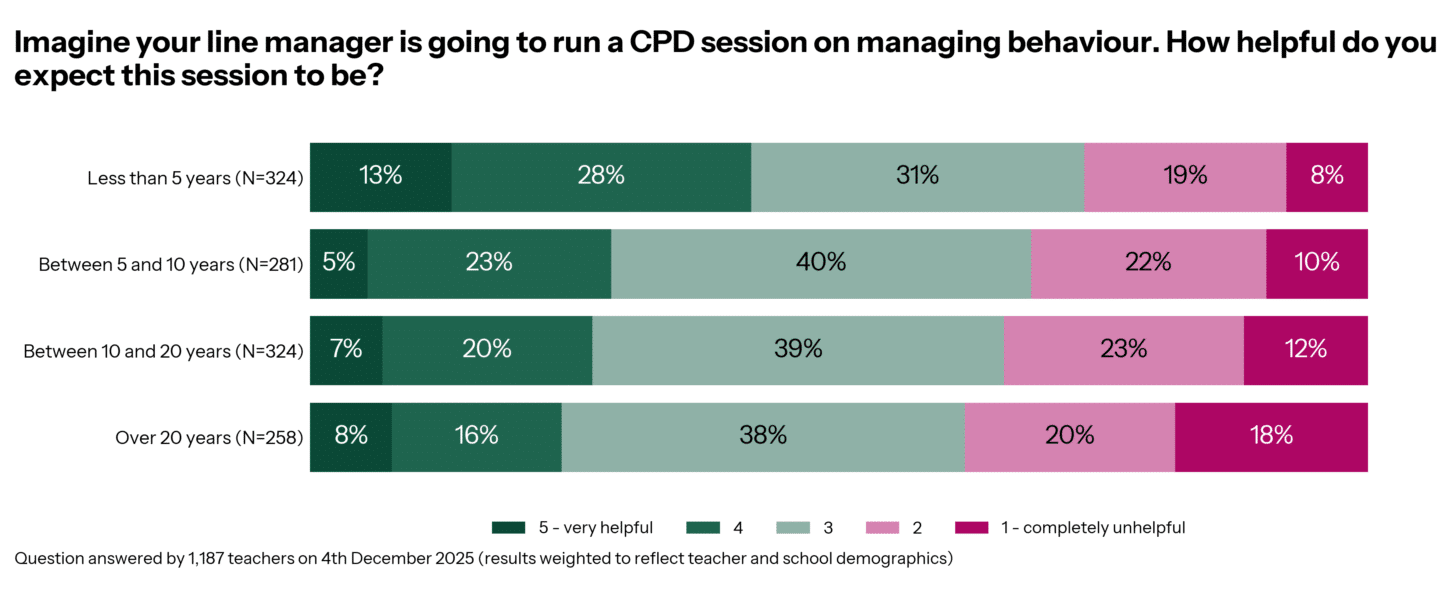 Across all three CPD topics—managing behaviour, planning lessons, and dealing with parents—a clear pattern emerges: the more experience a teacher has, the less helpful they expect a line-manager-led session to be.