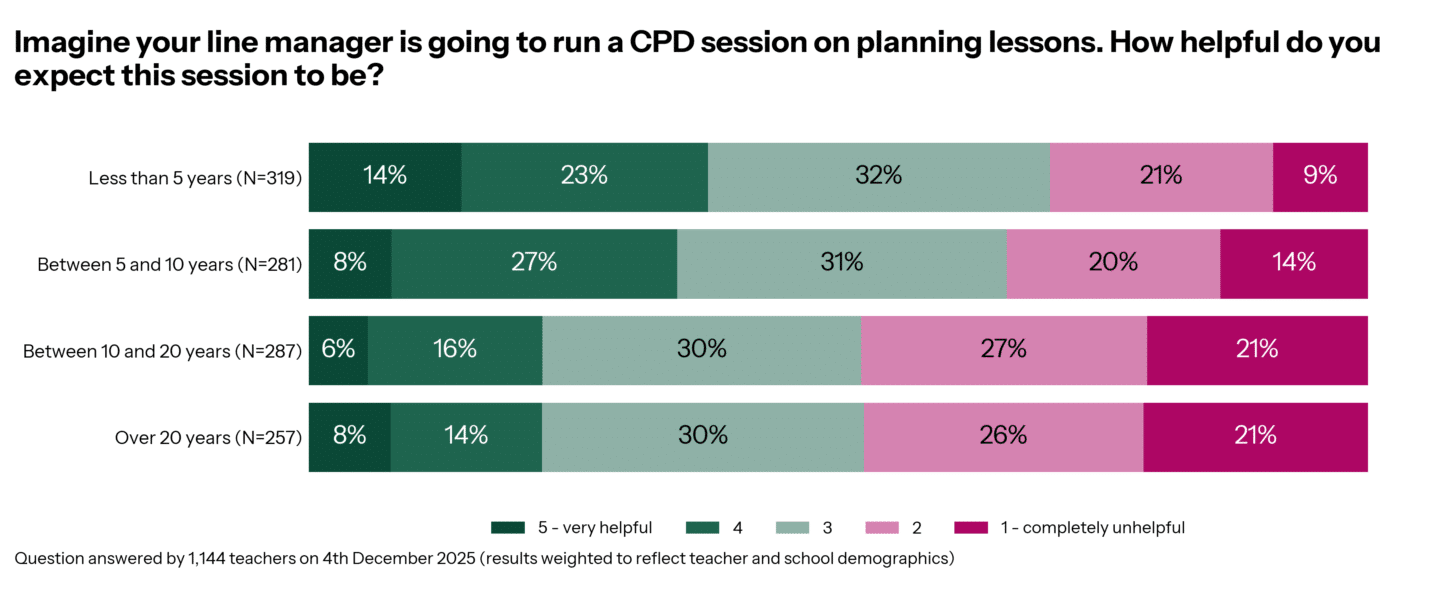 Taken together, the charts suggest that scepticism grows with years in the profession, and that perceived usefulness depends less on the topic itself and more on whether teachers believe their line manager can offer genuinely new or developmental support.