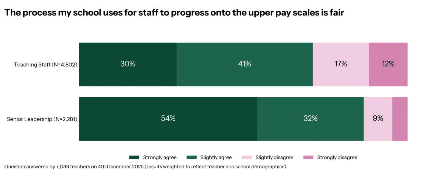 We asked if Tappers thought the process used in their school to progress onto the upper pay scale was fair. The first finding that sprang out was how many teachers didn’t know what the process was: 33% of teachers and 10% of senior leaders don’t know how the process for moving onto the upper pay scale works in their school.