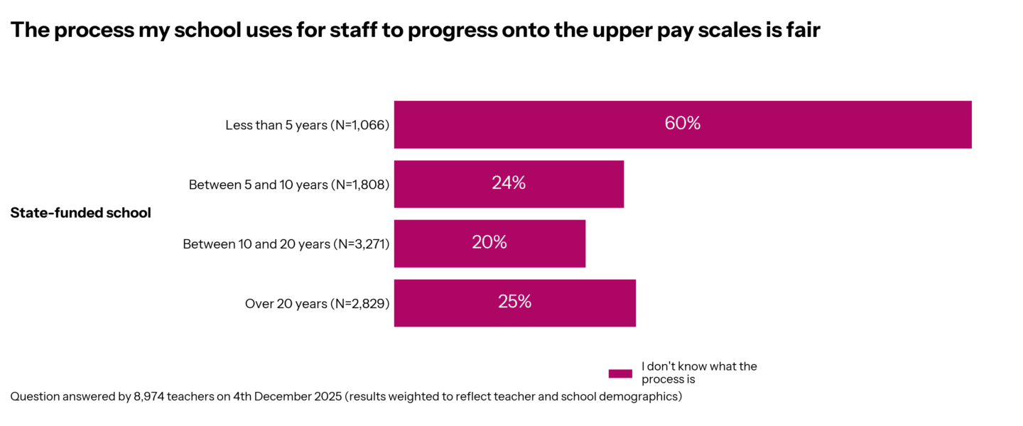 Worryingly, it was mostly among the very teachers who should be preparing to go through the pay scale: 60% of teachers with less than 5 years of teaching experience and 24% of teachers with between 5 and 10 years of experience say they don’t know what the process is.