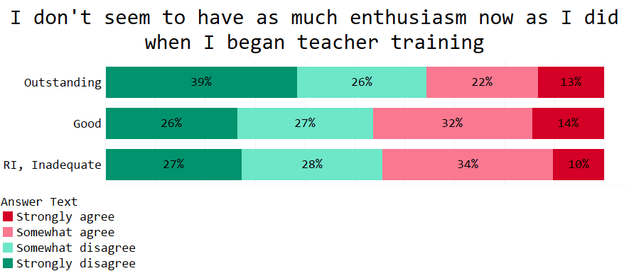 A bigger difference was in the Ofsted grading of a school. Teachers working in outstanding schools were far more likely to disagree (the dark green bar), and so show more enthusiasm, compared to those in good or inadequate schools.
