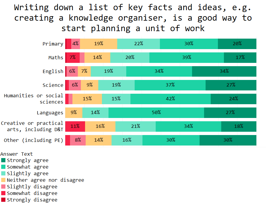 But, ironically, maths teachers don’t show quite the same pattern. Around 23% of maths teachers are ambivalent towards knowledge organisers, second only to primary and creative arts teachers.