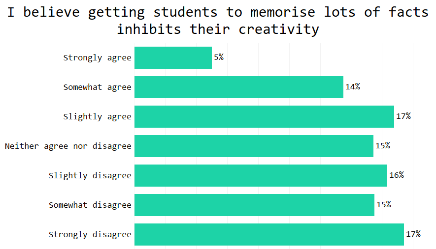 Language teachers were much less divided. 77% disagreed that memorising facts inhibits creativity, and just 7% felt ambiguously about it. (To be fair, have you ever tried to creatively communicate in a language you haven’t learned?!)