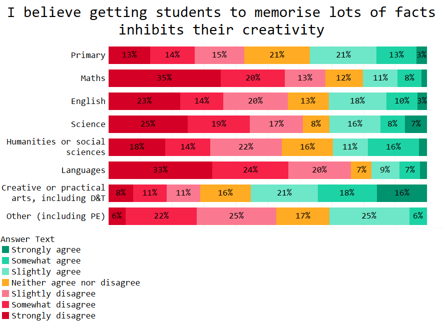 Here’s another example of the way a simple question becomes more complex when you break it down by subject. When we asked whether memorising facts inhibited creativity, we found that more teachers disagreed than agreed.