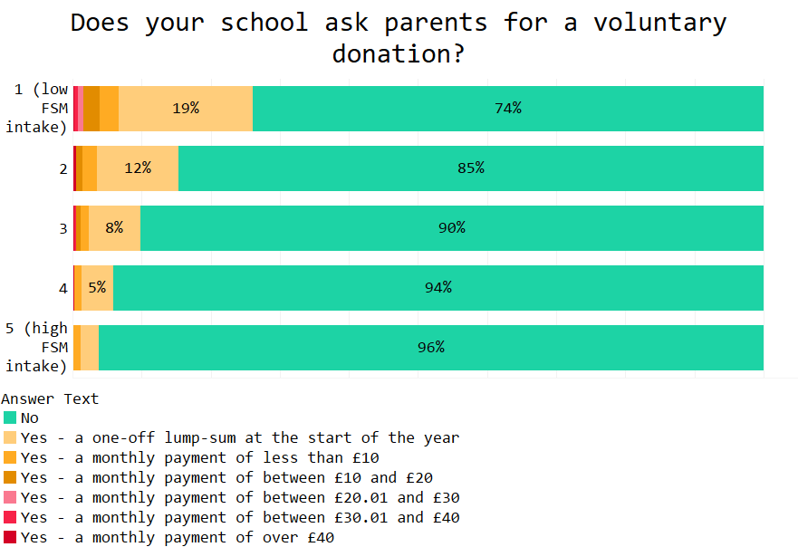 As the bright green bars below show – most schools do not ask parents for a voluntary donation. Among those who do, the most common request is a one-off payment at the start of the year.