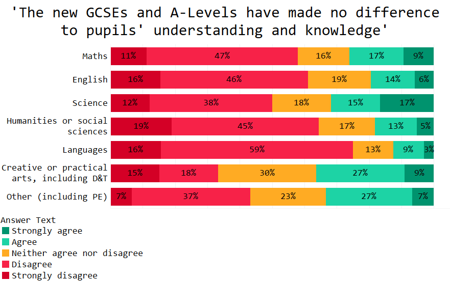 A recent ASCL and TES poll found that half of school leaders felt the new GCSEs and A-levels had made ‘no difference’ to pupils’ understanding and knowledge.