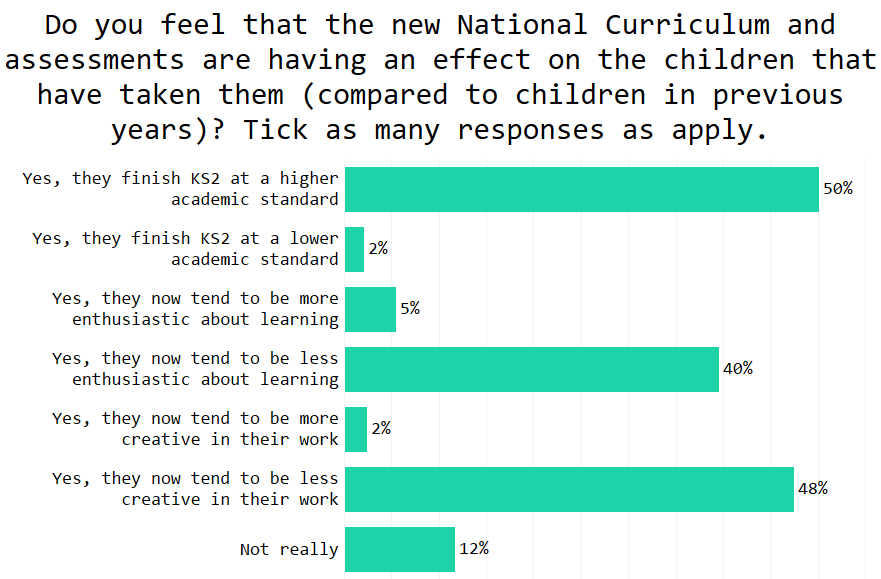 First, it’s worth noting these are perceptions. If children are doing less creative work because they are busy preparing for SATs exams, then it may be that teachers see that children are now less creative in their work but, secretly, up in their bedrooms, they are crafting away at endeavours more creative than anything seen previously among 11 -year-olds.