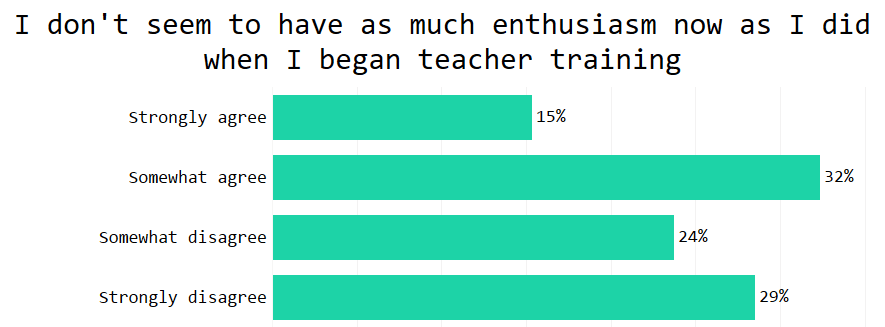 Around half of teachers are more (or equally) enthusiastic as when they started teaching. The other half have waned, but only 15% report a strong difference.