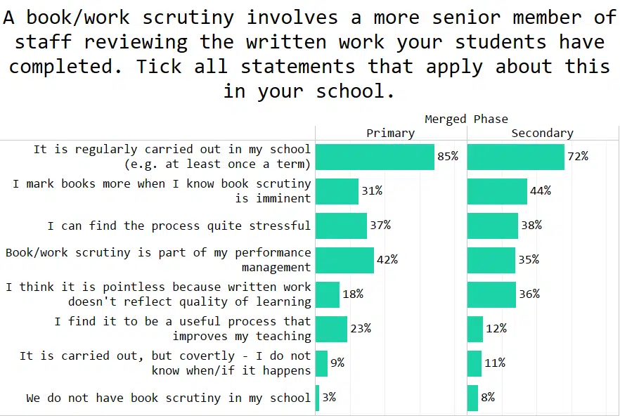 Around 4 in 10 teachers said they find the process stressful, and 37% of teachers have book scrutiny included in their performance management. (No wonder it is stressful).