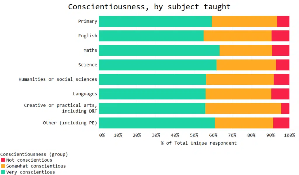 To find out we asked three questions from the scale. The majority of teachers answered in a way that suggested they are conscientious (between 80-90% each time).
