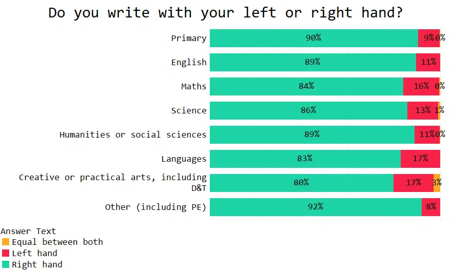 Note that creative arts also had 3% of teachers who said they were equal between both their left and right-hand.