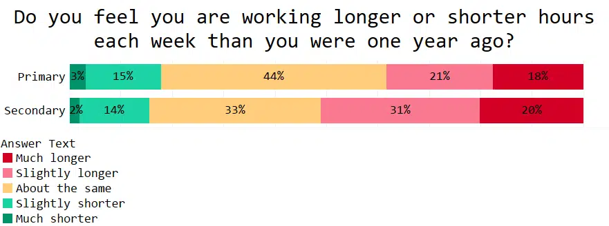 Compared to a year ago, 35% of teachers are working the same hours, 28% working slightly longer, and 21% working much longer.