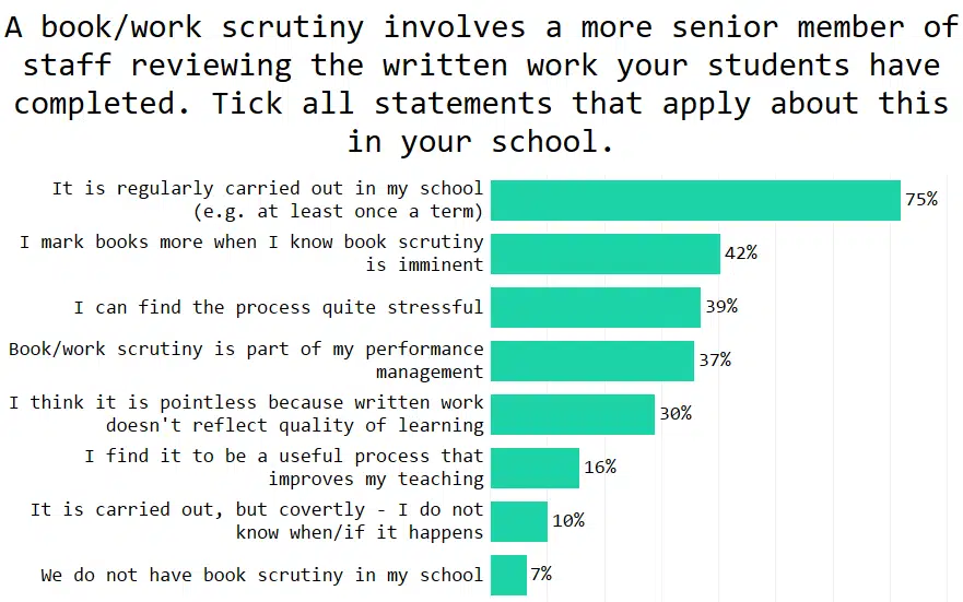 Around 4 in 10 teachers said they find the process stressful, and 37% of teachers have book scrutiny included in their performance management. (No wonder it is stressful).