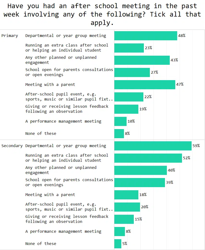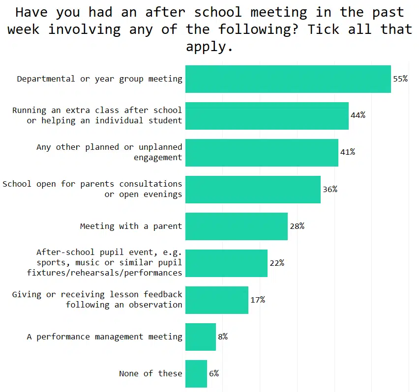Teacher Tappers are holding meetings or running clubs long after our app buzzes at 3:30pm each day. Over half of you had a departmental or year group meeting last week and most schools seem to be buzzing with students or parents taking part in open evenings, school clubs and performances every week. Just 6% of you had no scheduled or unscheduled meetings at all.