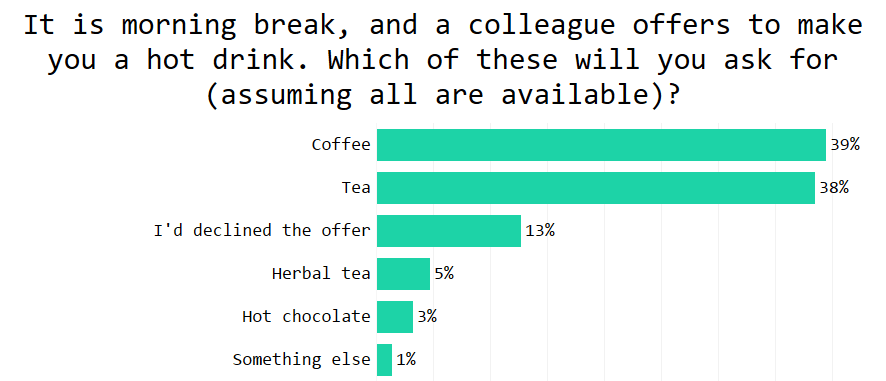 It is neck-and-neck in the staffroom between the coffee and tea drinkers at morning break. Coffee is just ahead with 39% of you requesting it. A staggering 13% of you would decline the offer of a colleague to make you a drink. Remember, this is a question about morning break. We’ll ask about afternoon break another time to see whether teachers make the traditional switch into afternoon tea drinkers.