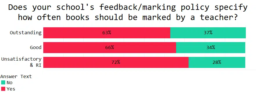 We thought that schools subject to Ofsted or RSC ‘monitoring’ visits would be more likely to have prescriptive marking policies, and they do. Though the differences between Ofsted judgements perhaps isn’t as great as we thought it might be.