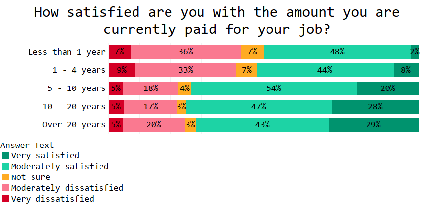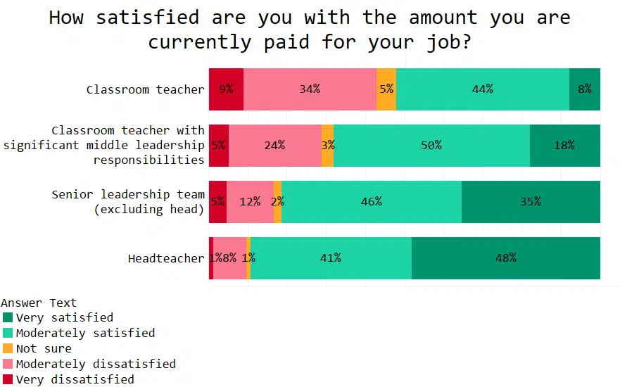 Most teachers aren’t in it for the money, but a decent salary does help to make you feel a little bit valued. There is one group of teachers who are happy with their pay – our headteachers! 48% of headteachers are very satisfied with their salary and 41% are moderately satisfied. By contrast, 9% of classroom teachers are very dissatisfied and 34% are moderately dissatisfied with their pay.