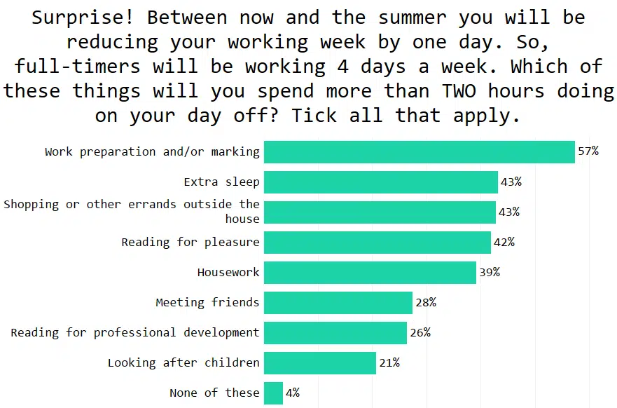 A confession. I’m afraid you won’t have a day off each week between now and the summer. We wanted to ask you what you would do if we gifted you this day to find out why so many of you wanted to reduce your hours (and take the pay hit). Most of you said you would WORK on your day off! I guess this would help ease your weekend, but we can’t have a profession where you have to work part-time to make the job do-able. Laura thinks modern life is impossible where everyone works and nobody looks after the household chores. Many of you agree and would spend your day off cleaning and running errands.