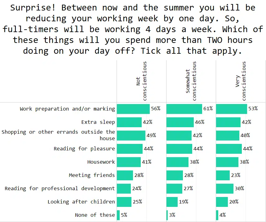 Laura also thought that our measure of how conscientious you are (have you noticed we’ve asked you six questions about this now?) would indicate how likely you were to work on your day off. Wrong! The most conscientious amongst you are no more likely to engage in work preparation.